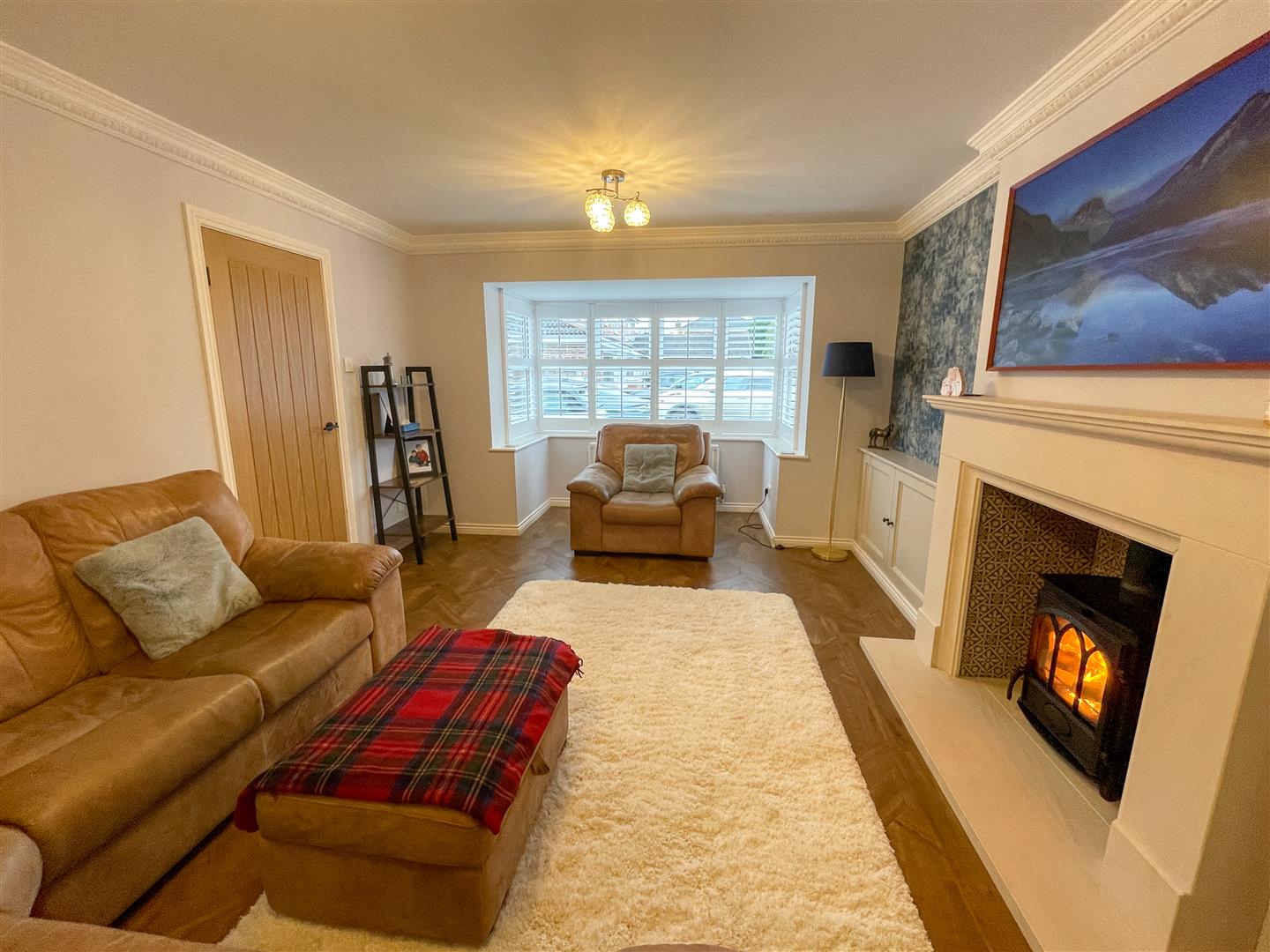 To the ground floor the property boasts a large living room with log burning stove and square bay window to the front of the property. To the rear the dining kitchen offers a great space with modern kitchen units with integral appliance including oven, microwave, induction hob with extractor fan over and dishwasher. There is an undermounted kitchen sink which is in keeping with the clean design of the kitchen. A large window to the garden at the rear provides the room with lots of natural light. The dining space offers an excellent space for all of the family to sit down together. From the dining kitchen double doors open to the conservatory which enjoys views over the garden.