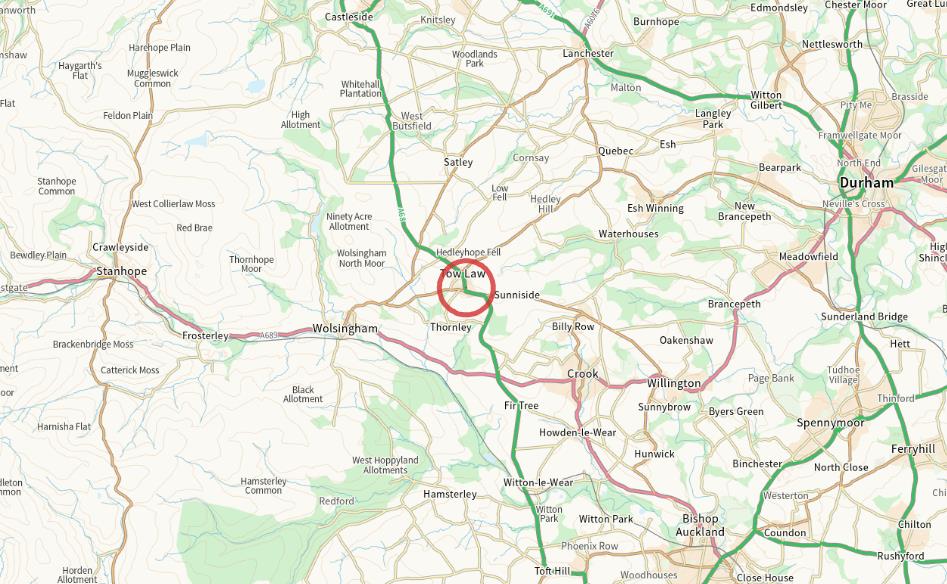 Tow Law is a small town in County Durham, situated alongside the A68 which runs between Darlington and Scotland. The town is a quiet rural community surrounded by open countryside. There is a range of local amenities including a small supermarket, convenience stores, butchers, and primary school. A wider range of shopping and recreational facilities can be found locally at Crook, Bishop Auckland, Durham and Consett. Tow Law is around 10 miles west of Durham City and 6 miles south of Consett.