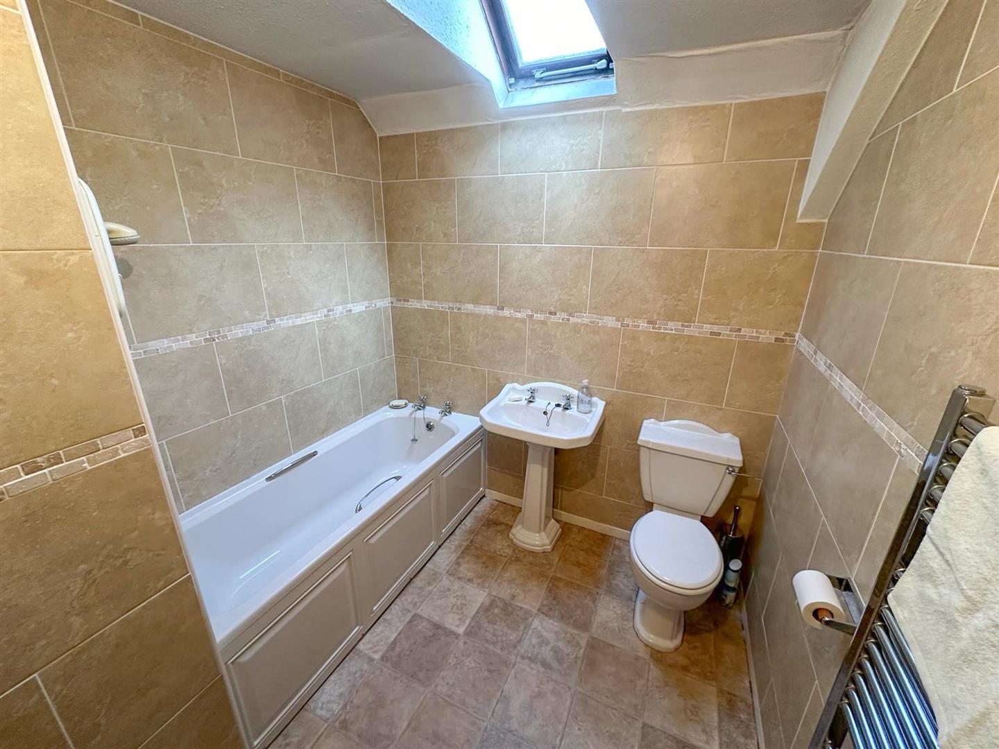 Returning to the inner hallway, stairs rise to the first floor where there are three bedrooms. The larger two bedrooms both have cast iron fireplaces with the largest bedroom having useful fitted wardrobes, a window to the side of the property and roof light. The second bedroom also has a roof light along with a low level window and exposed beams adding to the character and charm of the room. The third bedroom also benefits from useful fitted storage and roof light. The family bathroom is fully tiled with a mosaic border and comprises a bath, WC and wash hand basin along with useful storage cupboard.