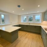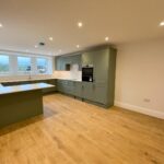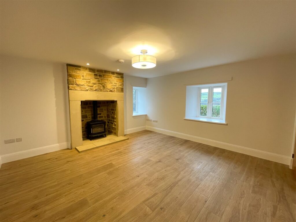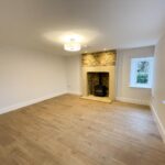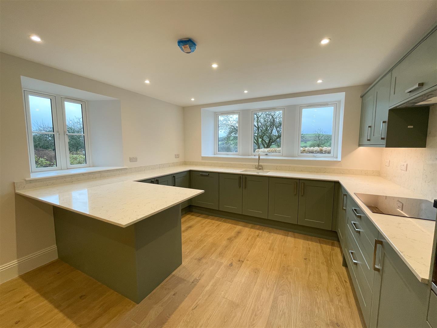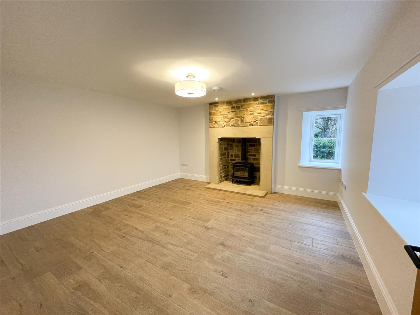 The kitchen lies to the front of the property and is a large spacious room with space for a large dining table with views to the front garden and to the countryside beyond. There are stylish sage green kitchen units with soft close doors and drawers, and marble worktops. There is an integrated double oven, fridge/freezer, dishwasher and induction hob with extractor fan over. There is an island style breakfast bar for more informal dining. The living room is another well proportioned room with a dual aspect and a stone fireplace with wood-burning stove.